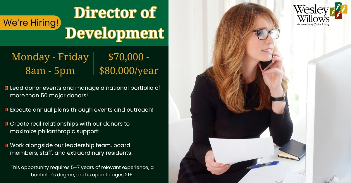 Start a new career as the Director of Development at Wesley Willows, a senior living community!