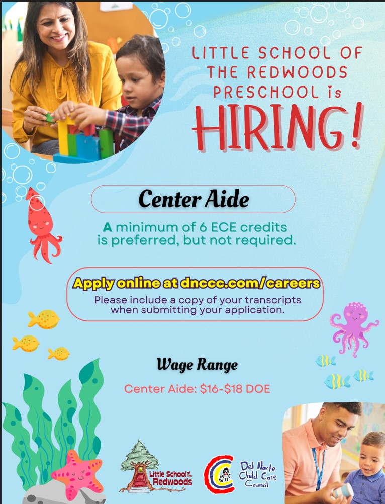 Have you ever wanted an exciting career working with children? Del Norte Child Care Council is now accepting applications for Center Teacher's Aides for the Little School of the Redwoods.
